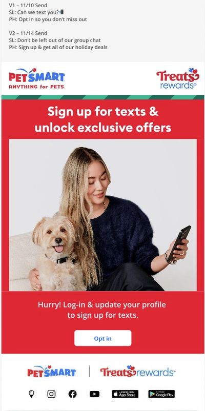 The request was simple: encourage pet parents to opt-in to SMS messaging, a proven vehicle for better customer engagement. There were two sends, each with compelling subjects lines that implied the customer was missing out by not receiving PetSmart texts. The result was an increase in engagement and higher sales.